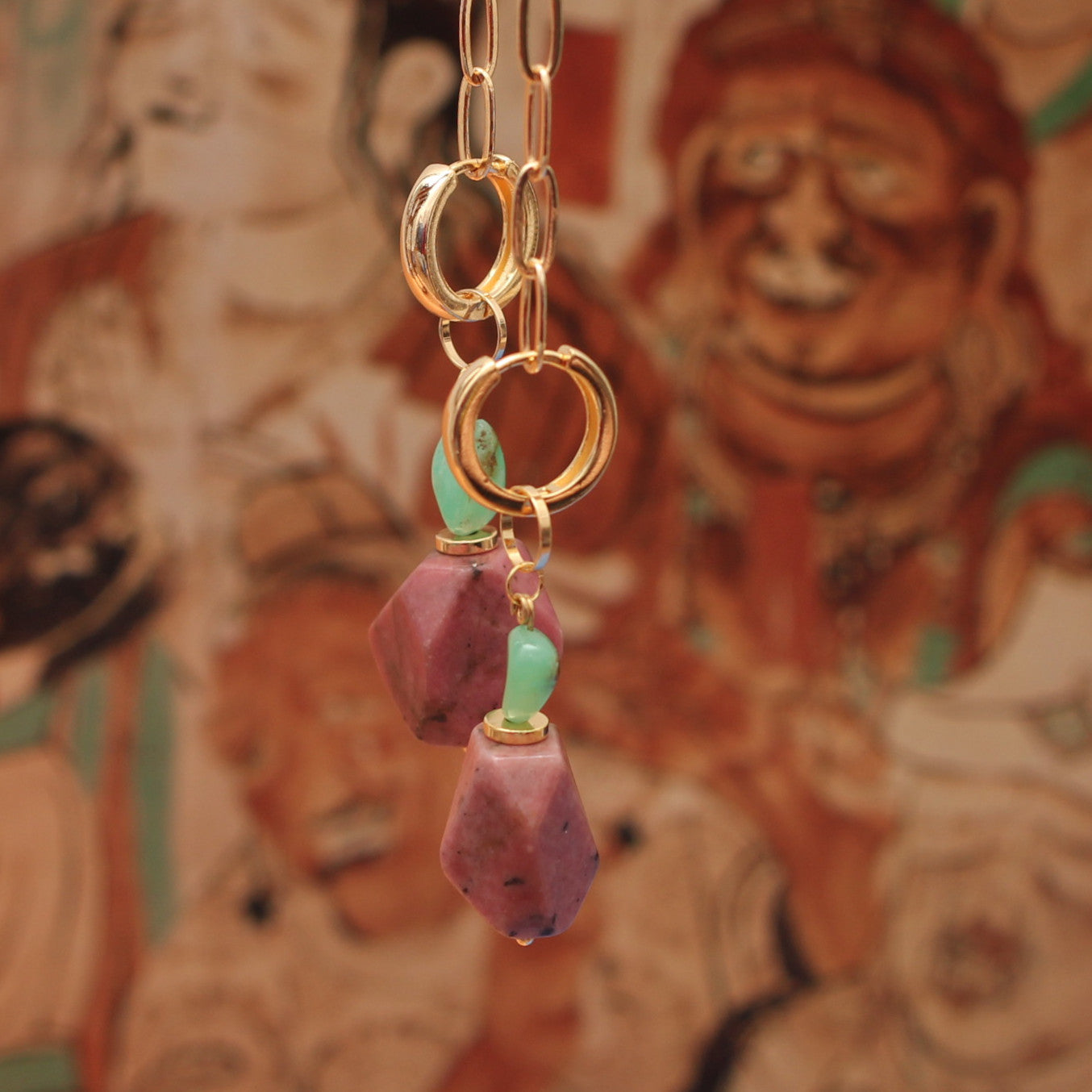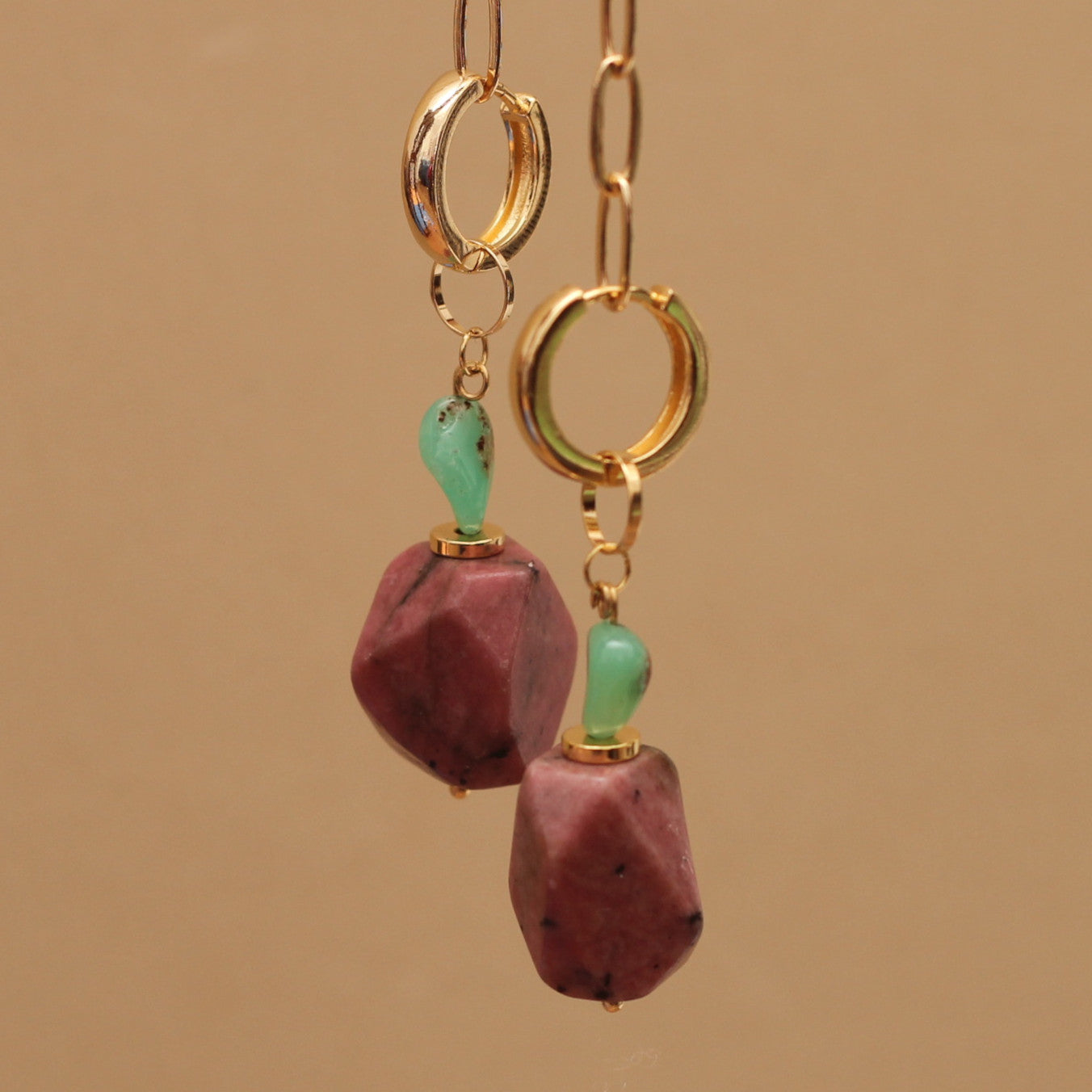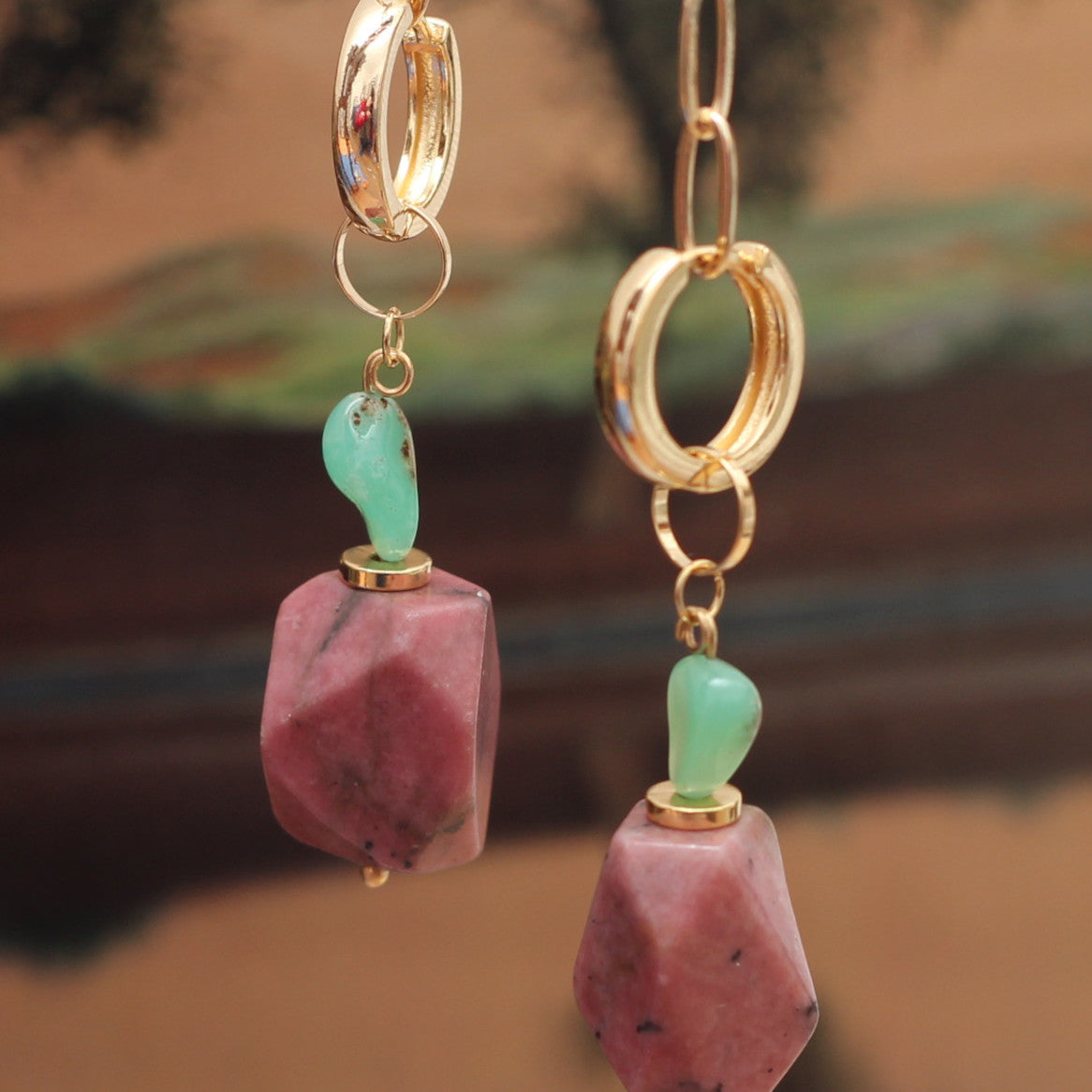 O Brinco Aurora é uma verdadeira celebração da harmonia entre cores e texturas. Suas pedras naturais em tons de rosa e verde refletem leveza, feminilidade e conexão com a natureza, enquanto o banho de ouro 18K adiciona brilho e sofisticação. Um design moderno, com toque artesanal e acabamento impecável.