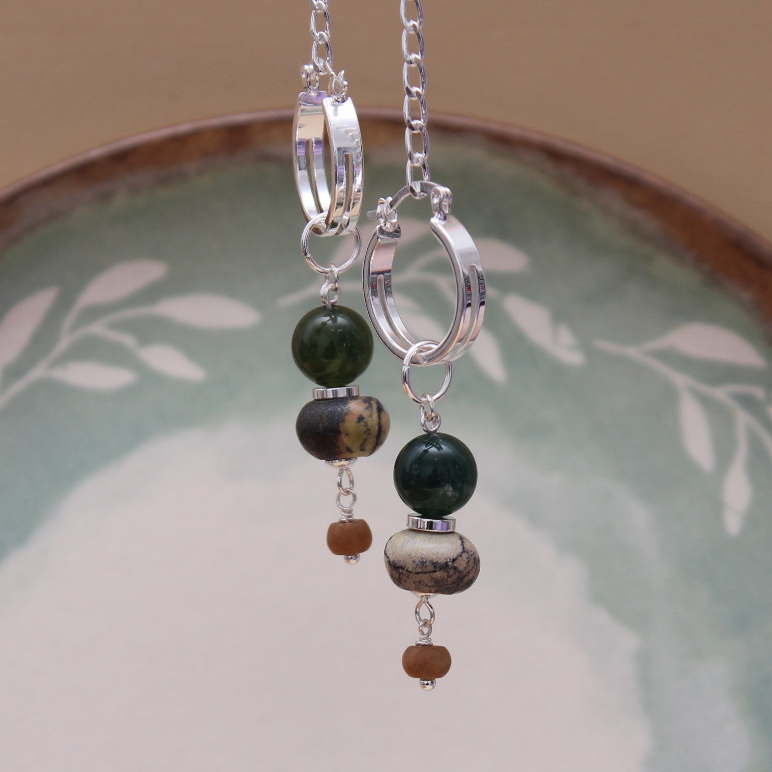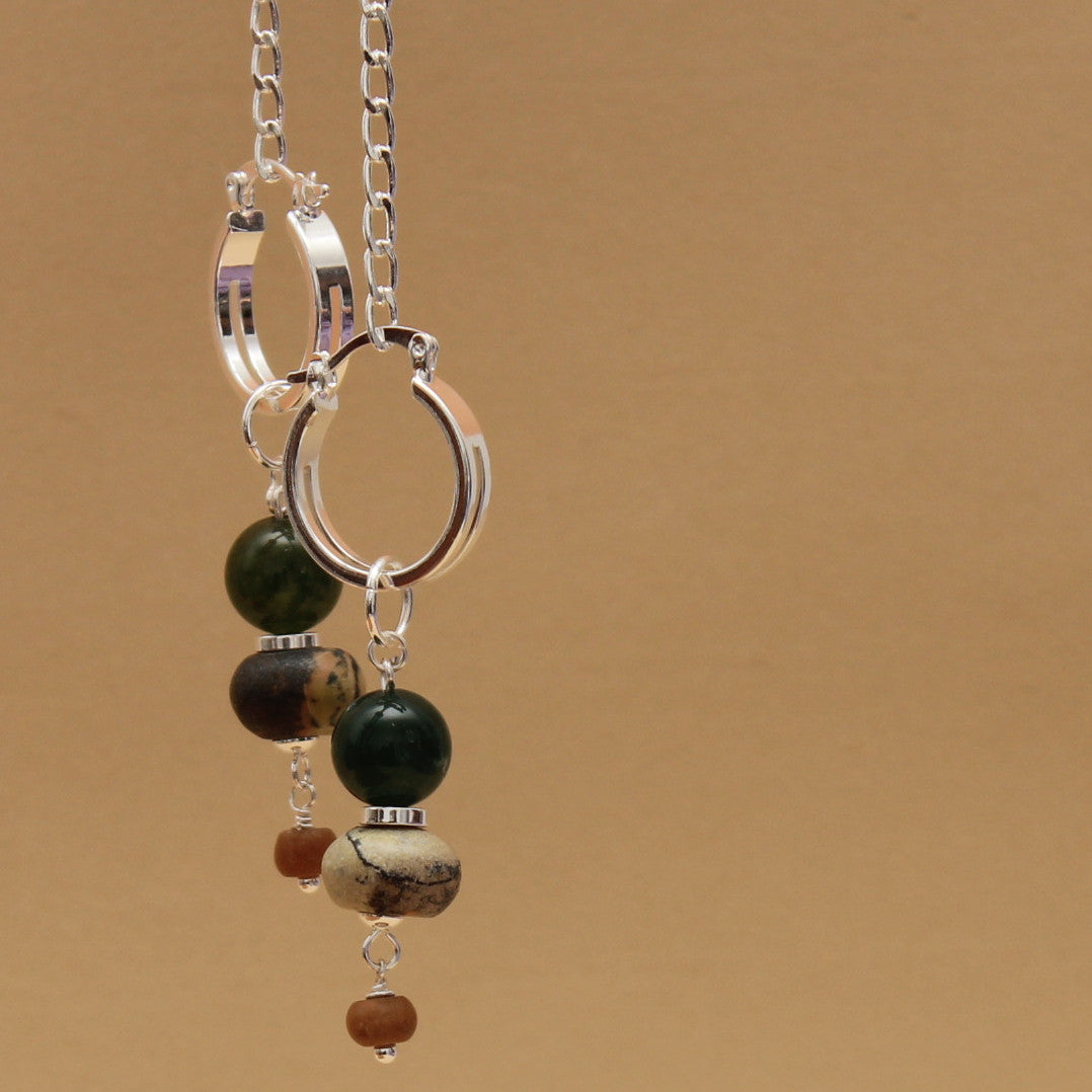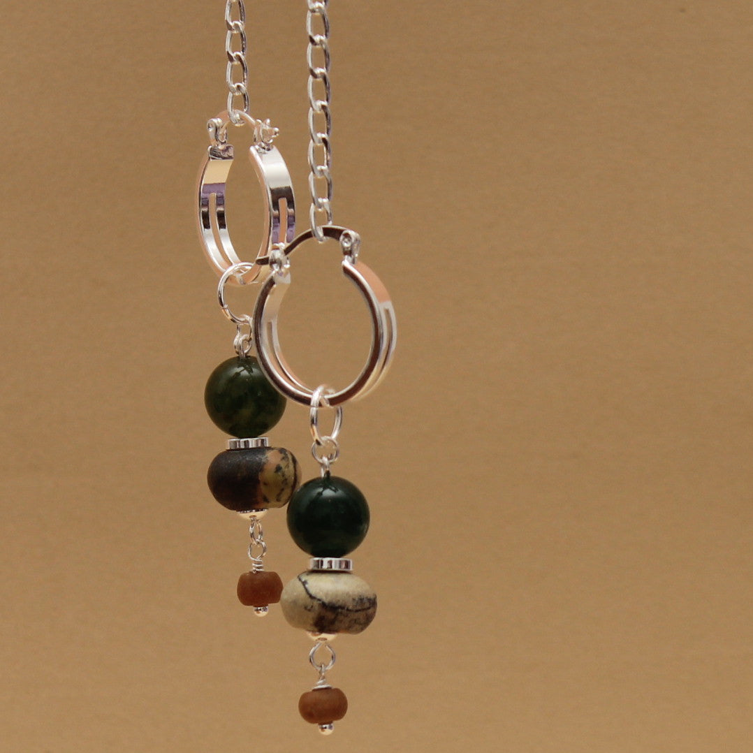 Inspirado nas cores da terra e nas formas orgânicas da natureza, o Brinco Raízes combina o brilho nobre do banho de ródio com pedras em tons de verde musgo, marrom terroso e bege marmorizado. O design em argola circular com pingentes esféricos cria um movimento leve e elegante, revelando um equilíbrio perfeito entre rusticidade e requinte.